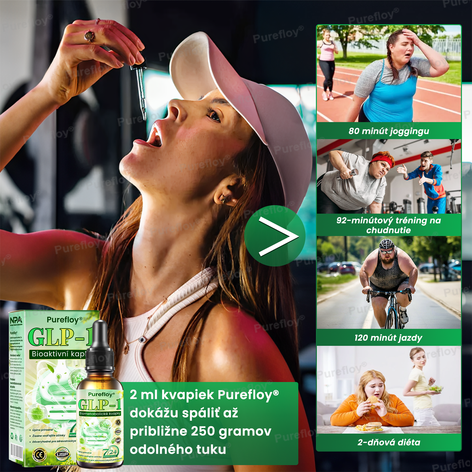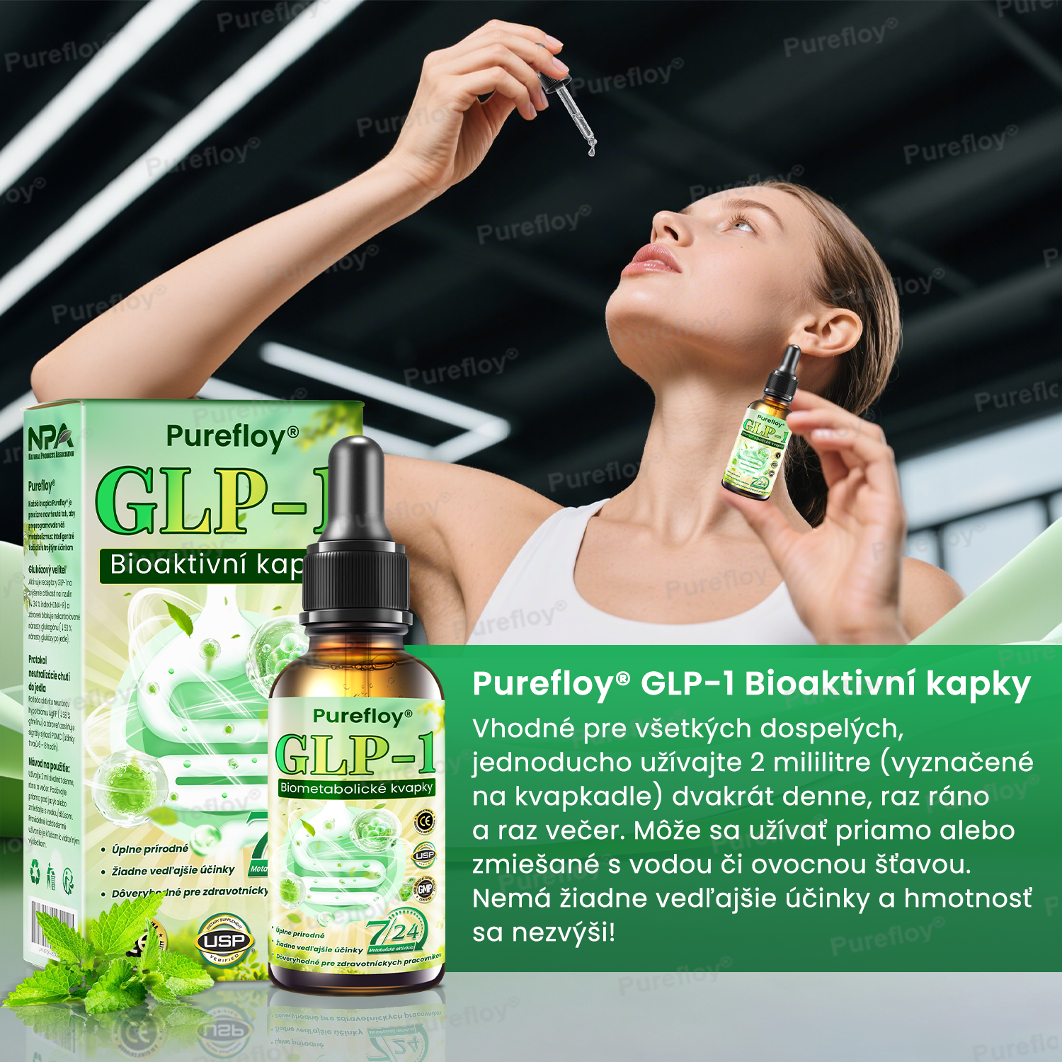Purefloy® GLP-1 Bioaktivní kapky sú vhodné pre všetkých dospelých, stačí užiť polovicu pipety (2 ml) denne. Bez vedľajších účinkov! Hmotnosť sa nevráti!